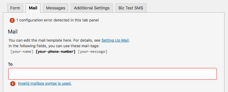 To receive a Text notification when an email is sent, enter a phone number (We suggest your Biz Text Number). By entering a number you will enable email notifications by Text for all Contact Form 7 forms.
